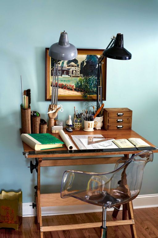A well-lit workspace is essential, especially when it comes to detail-oriented crafts. If your overhead lighting isn't strong enough, bring in a second table lamp. Or save surface space with a sconce. Hang a pretty picture up, paint the walls blue, and add some contrast with a modern lucite chair, like this small work space designed by J.P. Horton.