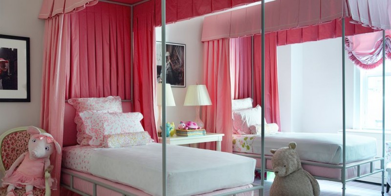 Kate Rheinstein Brodsky's Manhattan apartment is the picture of panache. In the girls' bedroom, the beds are by Hollyhock, the canopy curtains are of a chintz by Fabricut, and the sheets are by D. Porthault. The carpet is by Patterson Flynn Martin, and the walls are painted in Benjamin Moore's Bridal Pink.